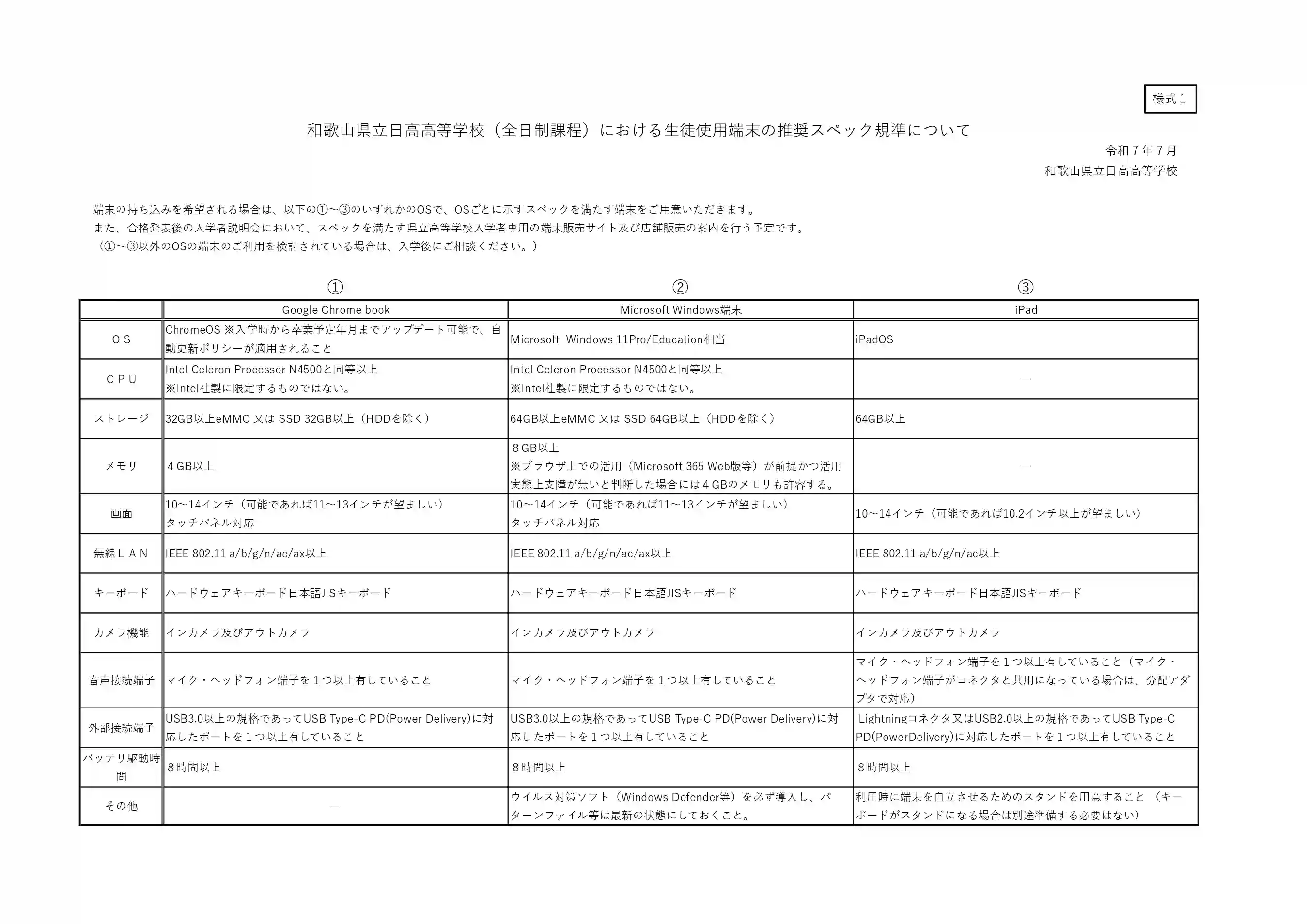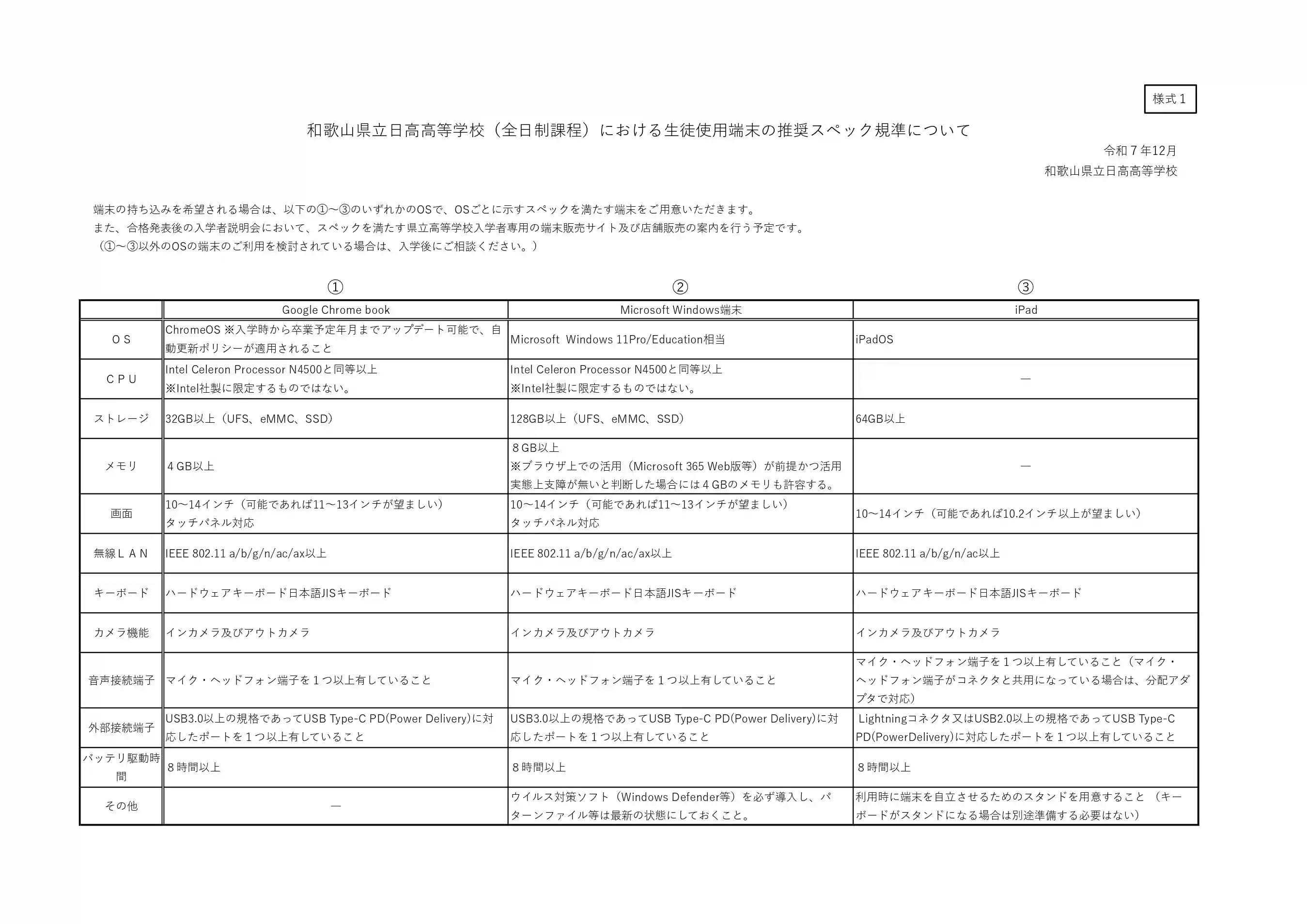 県立高等学校では令和8年度入学生から、情報活用能力の更なる向上を目指し、学校の端末の貸与を受けるか、自分の端末を学校に持ち込むかを選択できるようになります。自分の端末を学校に持ち込む場合の推奨スペック規準についてお知らせします。