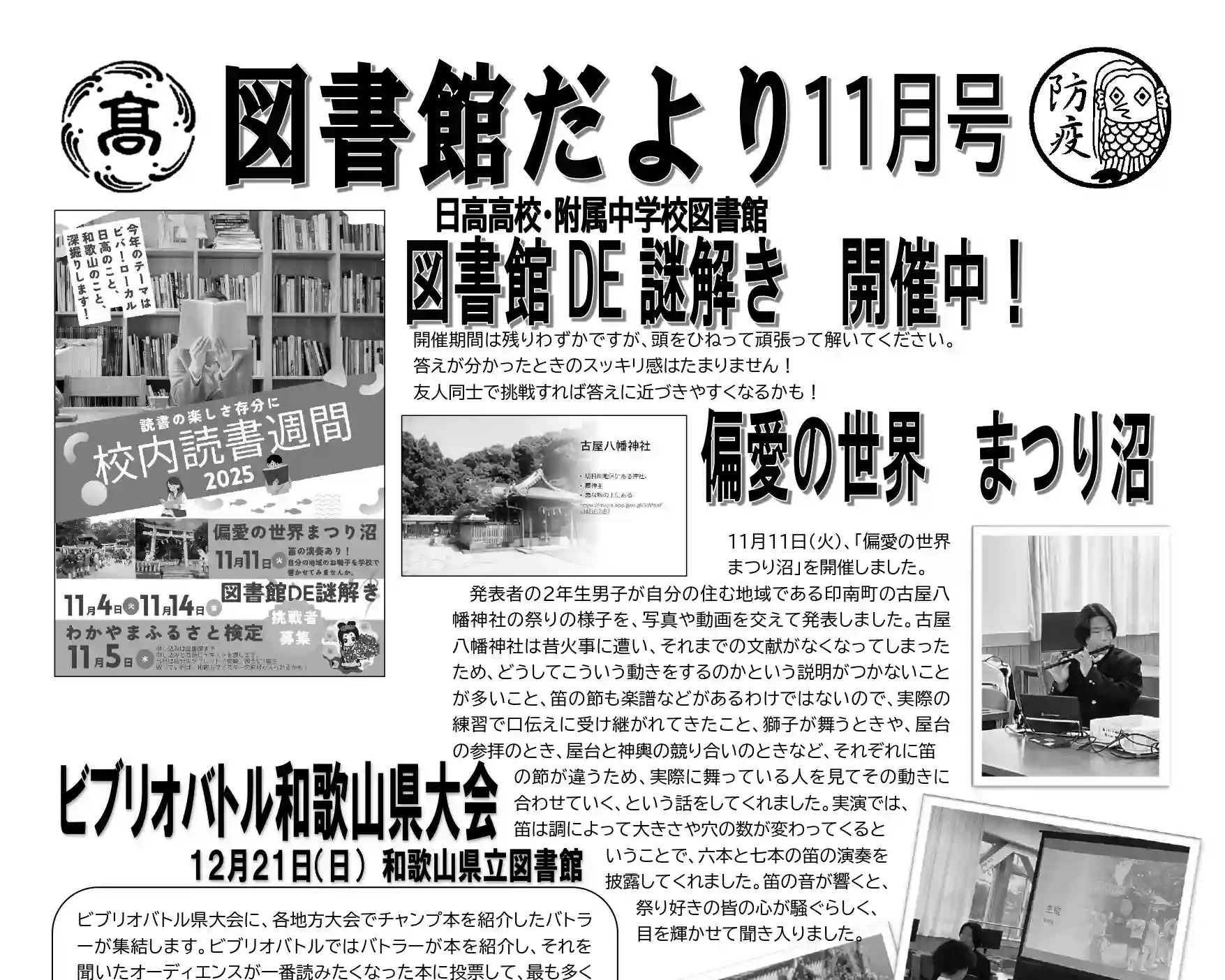 日高高校・附属中学校図書館にはおよそ2万7千冊の蔵書があります。授業利用はもちろん、年2回のイベントでは生徒の皆さんが楽しめる企画を開催しています。読書に、勉強に、憩いの場として、気軽に利用してください。
